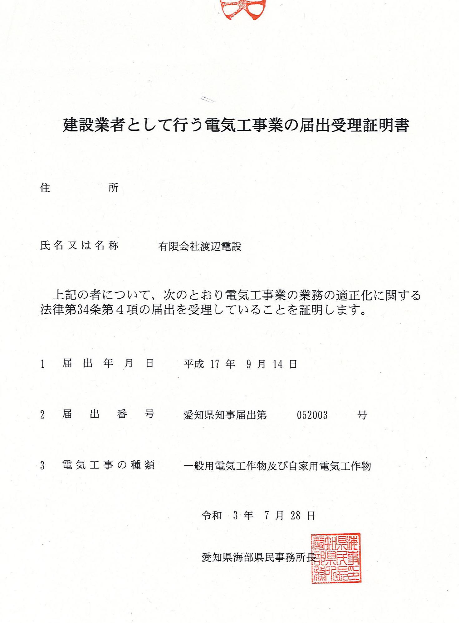 | 平成17年9月 | 一般用、自家用電気工作物とし愛知県知事に電気工事業を届出。 |